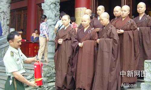 消防官兵教尼姑正确使用灭火器材。李世忠 摄