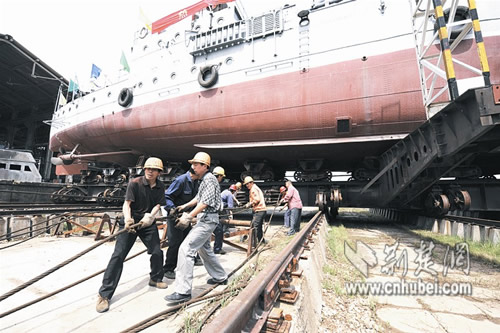 一代名舰中山舰在(湖北)武昌白沙洲停放11年后,昨日(5月14日)上午开始迁移。经过6个小时的作业,下午3时,中山舰被移到长江边上的指定位置。