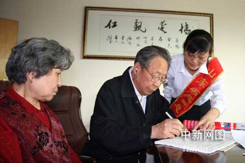 图为一对老人来到山东省慈善总会“慈心一日捐”暨抗震救灾捐款接收办公室捐出善款。作 者:耿丽君