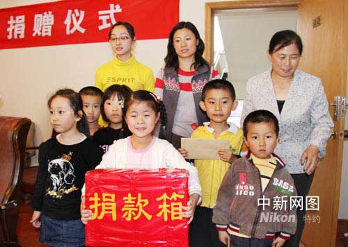 图为在老师带领下幼儿园的小朋友把捐款箱搬到了捐款现场。作 者:耿丽君