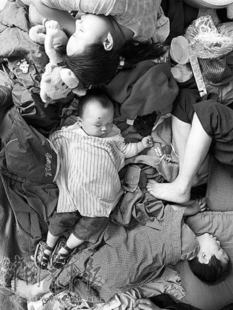 刘碧树的妻子环顾四周,看到很多孩子和父母都在露天打地铺,眼圈一下红了:“小孩子不能洗澡,又天天吃这些方便食品,怎么行啊?”