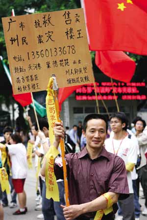 昨日,有一个人,随着号召募捐行动的志愿者队伍,从正佳广场西北门的活动现场一直跟到另一主会场侨鑫教育大院。他始终默默站着,没和任何人说话;而他手上,则举着一块自己制作的简陋牌子,上面写着“广州市民抗震救灾售卖楼王”,引来好多路人观望。