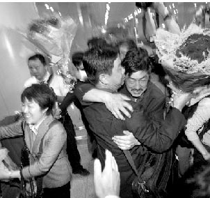 旅游团成员与亲友激动相拥。 董世彪 摄