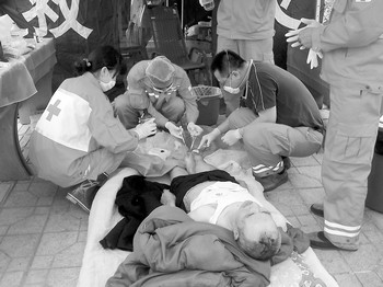图为省红十字会派出的紧急救援队员在给一位伤者清洗伤口。张勇摄