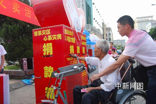 爱心圣火的第二个片段,发生在温州苍南。五月十八日是第十八个“全国助残日”,苍南县的四百多名残疾人汇集在苍南双台街路口的募捐点,为抗震救灾尽上一份绵薄之力。在不远处的灵溪影城广场,一个高两米四、宽一米二的捐款箱赫然醒目,张贴着四川地震救灾现场照片的多幅画板一溜排开,身着带有爱心标志统一服装的志愿者们不停地向过往的行人分发联合倡议书。