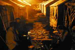 2008年5月19日晚,都江堰一正在分批搭建的临时灾民安置区,灾民在帐篷外面的空地吃饭。摄影(除署名外) 记者 王申