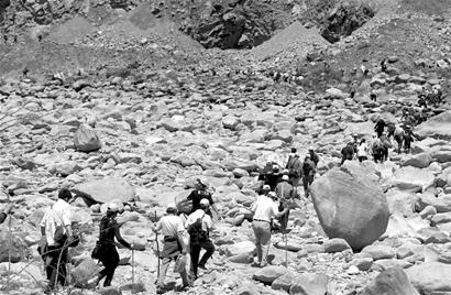 导游和师傅一前一后,护送着游客徒步往都江堰方向进发。在前行大约5公里后,公路路面已被滑落的山体及大量的石块完全中断。游客们只能手脚并用地翻过路障。其中很多老年人根本没有办法翻越两米多高的石堆,于是师傅在后边推、导游在上边拉,总算通过了这段障碍。