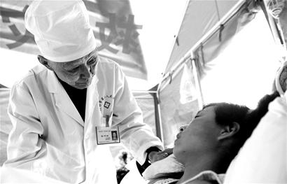 5月13日早上,什邡市第二人民医院院内的空地上临时救治帐篷内,伤者正在吃着医院分发的牛奶和鸡蛋,1楼门过道也挤满了受伤群众的家属。而过道上的另外一幕却格外让人感动:一张凳子旁边立着一根铁棒,铁棒上挂着一瓶装满药水的输液瓶,一个身穿白大褂、头发斑白、面容清瘦的医生正在进行输液治疗。他就是累倒在手术台,心跳停止长达1分钟的张泮林教授。“我们都劝他在临时救治帐篷中进行治疗,不要在外面,他坚决不干。他说,很多受伤群众需要立即治疗,不能占用病床。”曾祥武说,张泮林家在成都,他一个人在这里没有人照顾,医院提出找护士照顾他时,他也没有同意。