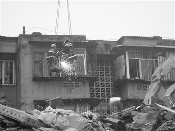 刘子军努力在悬摆的高空控制着重心,当7根防护栏终于被割断,刘子军跳入房间时,他惊出一身冷汗:房间客厅已被震出一个大窟窿,天花板不停地向下掉,太婆把自己反锁在卧室里,死活不愿出来。