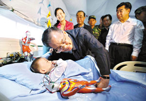 5月23日,温家宝总理专程到绵阳404医院监护室看望了3岁的小郎铮,称赞他“坚强、勇敢”。