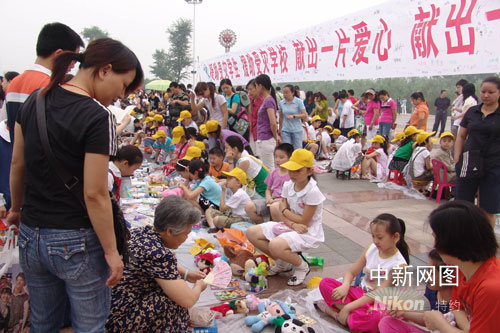 记者今日在义卖现场看到,伴随着一曲动情的《小孩别哭》乐曲,众多带着红领巾的小学生,摆出了自己珍藏多年遥控玩具、北京奥运吉祥物福娃、卡通漫画书籍、造型奇特的文具以及各种学习生活用品,当天的义卖会吸引了各年龄段的人群,叫卖声此起彼伏。