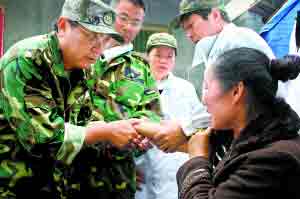 这边的诊断才刚结束,那边又传来新的情况。有位年过八旬的老人跑过来,请医生到帐篷里为自己的女儿诊治。将军二话不说,立即派出心胸外科主任李鲁跟着村民坐上自己的越野车,直奔那位村民所住的帐篷。“我们这个流动医疗队就是这样,沿途看到哪里有灾民居住的帐篷,就会过去询问是否需要医药,使那些地处偏远或行动不便的群众能够得到医疗救助。”