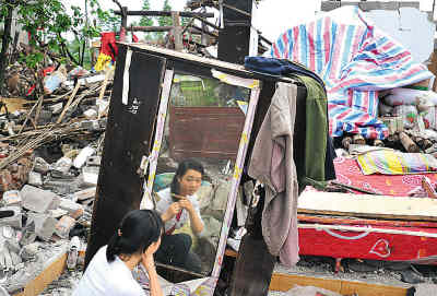 到绵竹汉旺镇,已是夜晚,黑魆魆中,一片片断壁残垣龇牙咧嘴,仿佛巨大的怪物。住在废墟旁帐篷里的一家人告诉我,旁边就是曾经温馨繁盛的家,曾经经营着建材和婚庆礼品的家。如今儿子遇难,人去楼空。在火车站的废墟上,一位老人颤颤巍巍地说:“这下面曾经埋葬了10多个人,上午见面还笑嘻嘻,下午就……”这10多个人被挖出来时都是一个姿势:一手捂头,一手伸向前方,仿佛要挡住轰然倒塌的巨物……