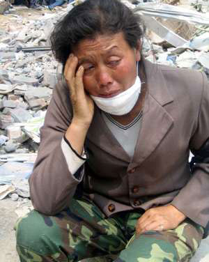 那边是盼望着孩子归来的母亲,一名坐在书堆上的妇人已经泣不成声。她说,大地震令她死了两个孩子,其中一个刚满17岁,都还没有找到,等待消息的日子,她都吃不下东西。她一面频频回头看着远远的挖掘现场,一面说,如果挖出了她的孩子,她无论怎样都会认得出来,因为孩子颈项上还戴着一块玉,是龙的形状。说罢,她又再满怀希望地冲向抬着担架的救援人员……。