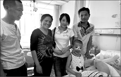 5月25日吃完午饭,一家人聚在小佳淇的病床前,本报记者为他们拍了张全家福。小佳淇爸妈和哥哥的表情都很僵硬,只有小佳淇笑得开心,还对着记者吐了吐舌头。