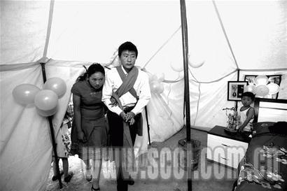 没有床怎么办?几个年轻人跟随王小波来到废墟中,费了很大劲,硬是从中把新床、新被单、毯子和被子给掏了出来。不过,王小波感到有些遗憾,因为没有把结婚证找到。“还不错,靠大家帮忙,现在啥子都整好了。”昨日上午正式举行婚礼前,王小波带着记者进入到帐篷“洞房”中。在这个白色素雅的帐篷里,一架崭新的床摆放在中央,上面铺着崭新的毯子、被子。一些好心的乡亲还专门给这对新人找来一些红布,悬挂在帐篷顶上,为这个简单的“洞房”增添了喜庆气氛。