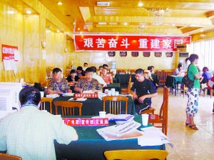地税局、国税局、物价局、财金办……四个红色的牌子立在一张铺有绿布的长桌上,每个牌子后面都有一名公务员在值班。长桌共计有11张,每张桌子上都至少摆放着三个单位的牌子——宣传部、广电局、人武部、组织部……根据初步统计,在天龙宾馆70平方米的餐厅里,有北川45个单位在紧张有序地办公。