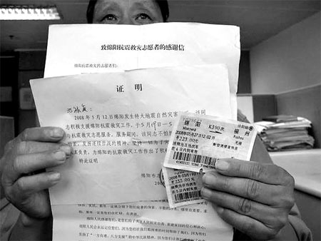 昨日中午,池先生向记者出示了身份证、退伍军人证、往返车票及绵阳市志愿者协会开具的证明和感谢信。池先生表示,虽然他违反劳动纪律在先,但是公司也不能扣下他之前的加班费。