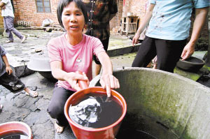 居住在后昌村21号的女户主杨秀萍把记者带到她家的水井旁,从井里打起了一桶水,记者看到,这井水确实黑如墨水,周围的地面上也黑糊糊的。“早餐和中餐,我一家4口就吃了些饼干”杨秀萍说。