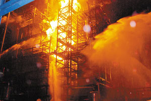 消防队员在奋勇灭火(李栋、孙江敏、陈德鹏摄)。