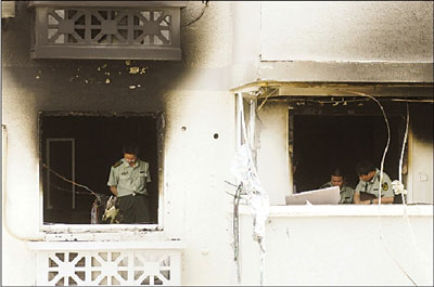 昨天上午,事发房间的窗户大部分被炸飞,楼体外侧被浓烟熏黑。306号楼西侧地面上散落着碎玻璃和坠落的铝合金钢架。