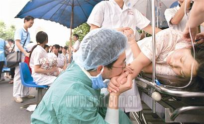 市民们和医生心手相连的场面打动了每一位路人,也刺激着我的快门不停响动。透过人群中的缝隙,一幕画面深深地打动了我的心灵,只见一位身穿手术服,头戴消毒帽的年轻男子正蹲在一台担架车旁,握着一位虚弱的产妇的手,无言地对视着,他们正等待着小生命的降临。突然,男子将她的手放在唇边,轻轻一吻,就像在说:老婆,你不要怕,一定不会有事,我们的孩子会平安降生。按动快门的同时,泪水滑过我的眼眶。