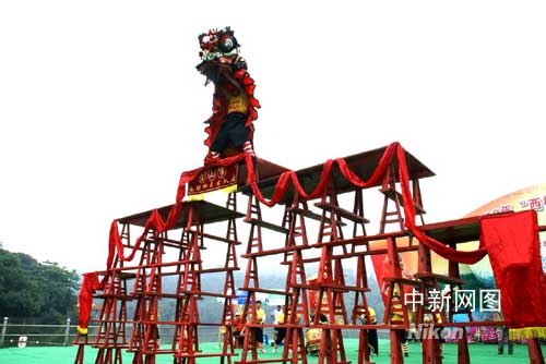 广东南海西樵山上的天湖公园,一支来自广东台山的传统南狮正在进行绝技表演, “狮子踩沙煲”、“南狮勇闯铁板桥”接连上演。