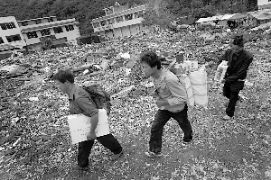 有村民肩上背着从废墟中扒出的几十斤腊肉,有的用被单裹着几件单衣,空隙处,塞满牛奶和火腿肠。