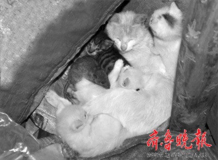 10日下午,记者闻讯赶到烟台建昌里3号孙淑君大娘家,此时孙大娘家里已经聚集了很多来看热闹的邻居,大家围在院子东偏房的猫窝周围议论纷纷。记者看到,在这个堆满了杂物的猫窝里,一只身长30厘米左右的母猫躺在角落里,在它的周围三白一花四只身长10厘米左右的小猫,有的在吃奶有的在嬉闹。令人不可思议的是,与小猫们一起嬉闹的居然还有一只七八厘米长的小老鼠。身陷猫窝,小老鼠不仅没有惧色,反而大方地在母猫和小猫身上爬来爬去,并不时地和小猫一起爬到母猫身下吃猫奶,小老鼠不仅不怕猫,对周围凑过来看热闹的一群人也视而不见,甚至有人拿一木棍去碰小老鼠时,它还张嘴试图咬木棍;而更令人称奇的是,老鼠吃猫奶时,母猫看老鼠的眼神透着温柔,很是怜爱,如同在看自己的小猫崽子,而四只小猫面对与它们抢奶吃的不速之客也丝毫没有敌意,五只猫和一只老鼠俨然是一家。