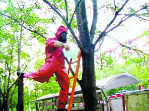 消防队员穿上防化服,迅速用事先准备好的麻袋将树上蜜蜂一举擒获。 (叶晓彦 通讯员 蒋魁文并摄)