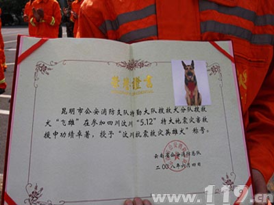 2008年6月6日下午,云南消防总队在昆明消防训练基地隆重举行仪式,授予赴川抗震救灾的“银虎”、“昆虎”、“小虎”、“金雕”、“菲离”、“威严”、“飞雄”7条搜救犬“汶川抗震救灾英雄犬”称号。云南消防总队总队长王子岗,副总队长代如田、洪利川,昆明消防支队支队长杨文华、政委卢桂平及支队在家党委成员出席授勋仪式。仪式由省消防总队副总队长洪利川主持。