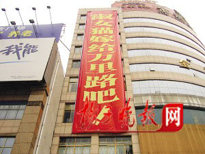 “淑女猫嫁给万里路吧!”昨天中午12时许,泰兴市鼓楼广场金龙大厦顶端,突然飘下这样“巨无霸”条幅,条幅宽6米,高32米,足有7层楼高,是一封公开的“宣言”。毫无思想准备的“淑女猫”,当场被感动得流下了眼泪,在接受了男友“万里路”赠送的999朵玫瑰后,还幸福地戴上了男友送的婚戒。记者了解到,这对年轻人借网络神奇相识并相恋,为抱得美人归,男子花4000多元大胆求婚。有人对此赞赏不已,也有人表示难以接受。