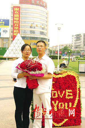 记者昨天下午赶到现场看到,“巨无霸”条幅挂在金龙大厦的东侧,由于地处闹市区,吸引了很多市民驻足围观。市民尹先生是“万里路”的朋友,参与了“万里路”特别求婚的整个“策划”过程。他告诉记者,当天中午1时,被男友“万里路”约到广场的“淑女猫”,无意中看到“求爱”条幅后先是一怔,刚转过身来,男友就像变魔术一样捧出了大把玫瑰花,并向她单膝下跪求婚,毫无思想准备的女孩顿时激动得流下了眼泪。还沉浸在幸福当中的“淑女猫”接受记者采访时说,她和男友是通过网络认识的,“万里路”“淑女猫”都是他们的网名,几天前男友曾对她表示有件很重要的事情要和她说,当时她没有过多在意。当天中午见到巨型条幅和999朵玫瑰花后,她感觉整个人都“蒙”了,幸福得“不知所措”、“也不知道说什么好”。