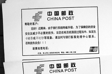 经过审讯,班某和甘某很快交代了他们诈骗作案的过程。据二人交代,他们先用塑料板将ATM机的出钞口堵住,并在ATM机上贴上提示,内容是:“尊敬的客户,当您取款不出钞时,请及时拨打银行服务电话××××、××××与客服中心联系,否则后果自负(上图)。有粗心的客户提款不出钞时,可能会拨打广告牌上的服务电话。