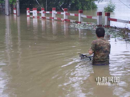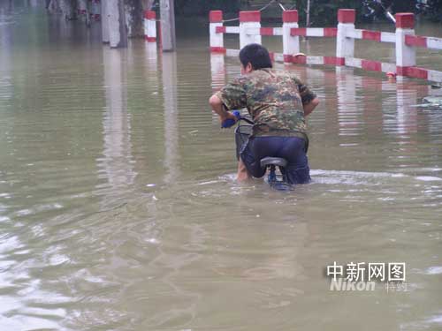 记者跟随当地政府工作人员乘坐冲锋舟慰问救助留守居民途中,在当地已部分被淹没得西溪街,一身穿迷彩服、短裤的中年男子骑着自行车顺着街道水面驶来。让人惊叹的是,自行车车身完全淹没在水中,人们从上面只能看到水中的车把手。该男子笑着对工作人员打了招呼,擦船而过,驶过一段路之后,自行车车身才逐渐露出水面。