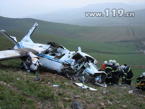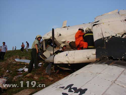 由于失事地点位于山区,消防救援车辆行进至距现场10公里处已无法继续前进。消防官兵迅速携带救援装备徒步行走,山高坡陡,道路极其难行,消防官兵于18时30分左右赶到飞机失事地点。救援人员发现失事飞机破损严重,右侧发动机仍在正常运转,未发生火灾。机舱外遇难者尸体两具,机舱内遇难者尸体一具、受伤被困者一名。消防官兵迅速利用剪断器、扩张器等工具将机体破拆,于18时50分将被困人员成功救出,随后又将另一名机舱内遇难者救出。并将获救人员送上120急救车,但是飞机的右侧发动机仍在高速运转,外壳已变色。消防官兵仅用两分钟时间关闭了外壳已发红的发动机,但此时机翼窜出火苗,消防官兵利用灭火器和沙土迅速将火灾扑灭。