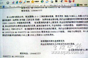 前天下午,记者在天涯网一则求捐肝源的帖子上看到一则跟帖:“本人长期与医院合作,现急需要A、B、O三种肝源和肾源,要求男性……”发帖的是一个名叫“真实可靠”的网友,帖上留有3个QQ号和1个手机号码。昨日下午3时20分,记者拨打了这个手机。
