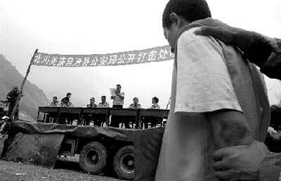 公开处理打击大会的会场选在了擂鼓镇安置点的一处路边空地。当天下午2点半左右,数百名安置点居民闻讯赶来。不久,18名身穿橙色马甲的犯罪嫌疑人分别乘两辆卡车被押至会场。为维护现场秩序,当地武警部队还派出了60名战士。由于北川公安局长谭佳敏未到场,一位副局长代其宣读了公开处理打击的决定,表示在震后部分不法分子进入灾区,进入住宅、商店、企事业单位盗窃财物,甚至从遇难者遗体上盗取值钱物件,民愤极大。