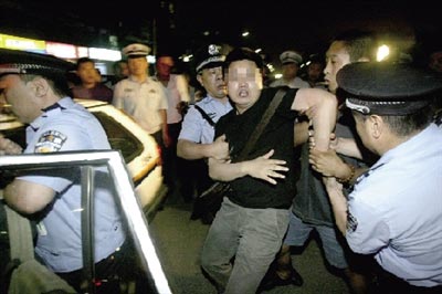阻碍执法的民警被带上警车。本报记者 董世彪 摄