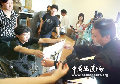 今天上午,吴华林坐着轮椅在其妻子的陪同下来到一中院听候宣判,法官宣布判决结果,要求全体起立时,坐在轮椅上的吴华林用双手撑住轮椅的扶手身子挺了起来。听到宣判结果,吴华林脸上露出了满意的笑容。他拿出自己写的“爱”字和“谢谢”的条幅赠送给法官,表达自己的感谢之情。