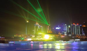 (重庆)市城市照明管理局的曾科长表示,6月21日20点40至21点之间,朝天门广场周围进行了激光灯表演,但是没有添加灯光效果的图案和文字。