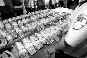 “天盾”行动中缴获的用茶叶包装袋装好的毒品。