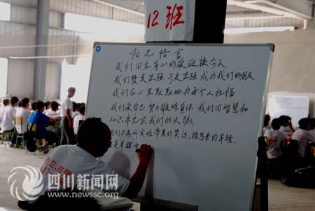 据介绍,在这间面积足可以挑战世界纪录的“教室”里,灾区的学子们在老师的引导下,正全力向自己的目标冲刺。这间“巨型教室”里面非常凉爽、整洁,桌面上堆着像小山一样的复习资料。在这些复习资料边上,是一大束洁白的栀子花。孩子们都喜欢栀子花,他们说:“栀子花的香味能让我们很放松。”这间堪称中国乃至世界最大的教室,长110米,宽80米,拥有8800平方米的面积。这本是当地一家制药公司刚刚落成的二期厂房,还没有装修,但用来做学校的教室、宿舍,却出人意料。
