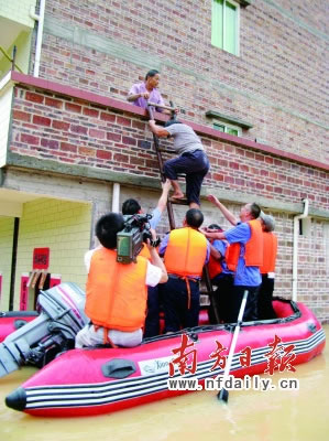 昨日下午4时许,笔者在该县播植镇龙福村委看到,属下的龙村、罗榕、湾头等10条村庄已是一片泽国,村道一端和楼房上零星散布的村民正在等待救援,几艘冲锋舟和橡皮艇来回穿梭,把村民们载到安全地带(如右图)。从市里全会请假回来的县委书记谭培安也亲临“泽国”指挥救援,数十名县镇领导干部正在现场忙碌,村中还不时传出如放鞭炮般的倒房声。一位刚刚被救出的80岁的阿婆说,活这么大岁数还未见过如此大的暴雨和山洪。据悉,该镇前日起遭受暴雨袭击,导致当地悦城河泛滥,河基崩溃严重,河水倒灌入村,受浸村庄10多条,受困村民2526人,倒塌房屋117户352间。前晚起,县、镇、村干部齐出动,分头深入受灾村庄连夜动员村民撤离,至昨日下午,已全部安全转移。(图/文谈细育龙许李均阳)