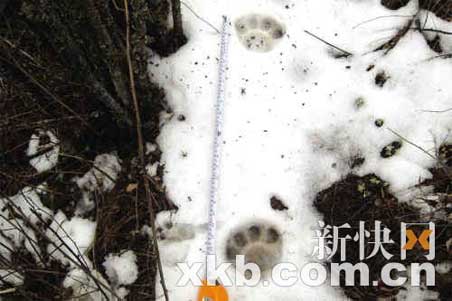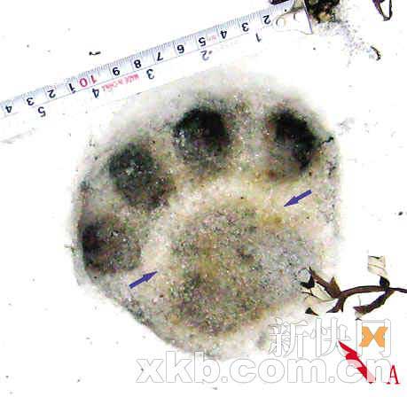 刘里远对此也作了解释:从照片(见图)可见前面那四个脚趾都不同程度地向前凹进。这是因为老虎在抬脚时,先抬起脚跟和脚掌,并且整个身体向前移动,则其脚趾尖在雪中向前推进,形成那样的内突凹陷。另外,我们还看到脚印的前沿有一明显的缺口,显然是虎脚最后离开时拖拽而成。刘认为这是一个典型的行进中的老虎脚印,几乎是不可能人工模拟出来的。