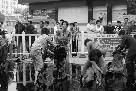吊车作业的过程中,就有部分人准备好簸箕、脸盆等工具,要抢泄漏在地面上的原油。7时许,见仍没有专门的清理人员前来清理路面上的原油,部分人开始哄抢原油,他们先是五六个人一组站成一圈,圈定自己的地盘,接着用衣服、簸箕、脸盆等工具收集路面上的原油,然后迅速装入编织袋内。
