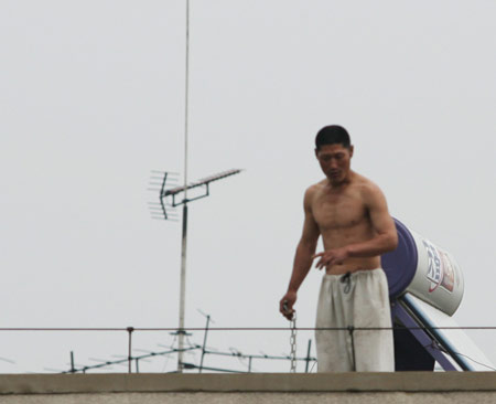 见楼下的围观者越来越多,张某开始大声呼喊,并将衣裤脱掉,然后在楼顶行走,这时天下起小雨,他又将衣裤穿上,过一会儿将衣服再次脱下。