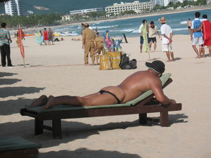 在南中国酒店西侧海滩,十多名男子赤裸裸地晒太阳,裸晒者均为男性,他们全身赤裸,皮肤晒得很黑。据裸晒者自己解释,他们裸晒是为了治疗皮肤病。记者问他们为什么不选择隐蔽的地方裸晒,他们并没有回答。
