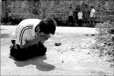 王彪在父亲死去的地方下跪痛哭。 记者 张沫 摄