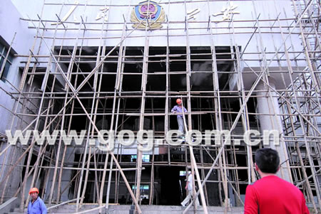 昨日中午1时许,记者来到瓮安县公安局,整栋大楼已开始清理、维修,大楼前部已搭起维修竹架,民工正在忙着修复被烧的大楼。
